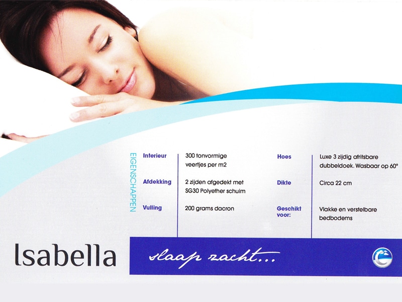 Die Isabella Taschenfederkernmatratze ist eine sehr komfortable Taschenfederkernmatratze mit Komfortschaumabdeckung. Diese Deckschicht ist bequem und elastisch. Die 7 Zonen bieten eine hervorragende Stütz- und Tragfähigkeit, zusätzliche Geschmeidigkeit im Schulterbereich und eine zusätzliche Verstärkung im Hüftbereich. Eine spezielle Verstärkung im Lendenbereich sorgt für Unterstützung. Diese Matratze ist 20 bis 21 cm dick und hat 3 cm Komfortschaum auf beiden Seiten. Der Liegekomfort ist mittel bis fest
