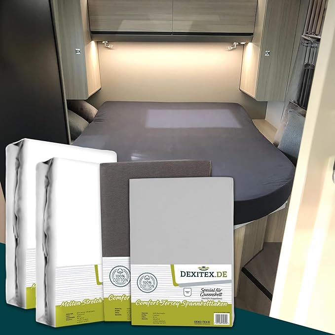 Suchen Sie nach günstigen Angeboten für ein Queensbett? Dann ist dieses Kombi-Set genau das Richtige für Sie. Dieses 4-teilige Set besteht aus 2 Flanell-Matratzenschoner und 2 Jersey-Spannbettlaken. Die Bezüge dieses Sets sind speziell für Queensbett-Matratzen entwickelt, d.h. alle Bezüge haben eine eingenähte Rundung am Fußende für eine perfekte Passform. So werden Sie im Wohnwagen, Wohnmobil oder auf dem Boot immer gut schlafen. Wunderbar flexibel und passt immer!
