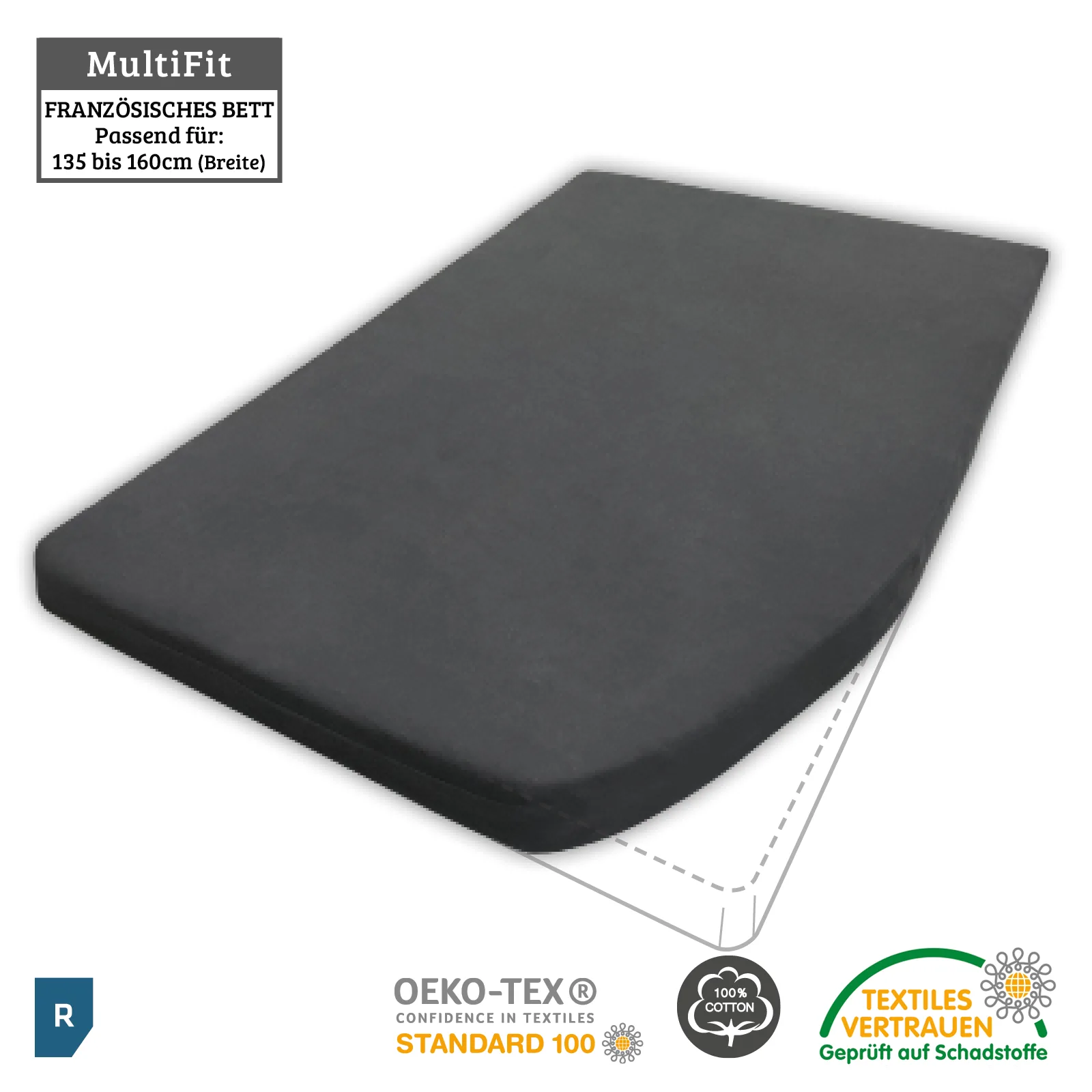 Einzigartig in Passform und Qualität, geeignet für französische Bettmatratzen und Topper mit einer Breite von 130 cm bis 160 cm Breite. Speziell vernähte Ecken mit Gummizug rundum sorgen für einen passgenauen Sitz und Abschluss um alle französischen Bettmatratzen.
