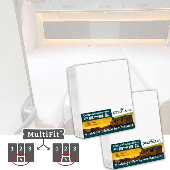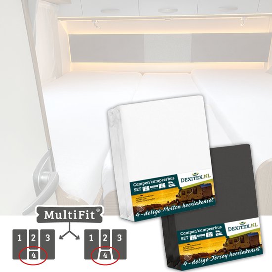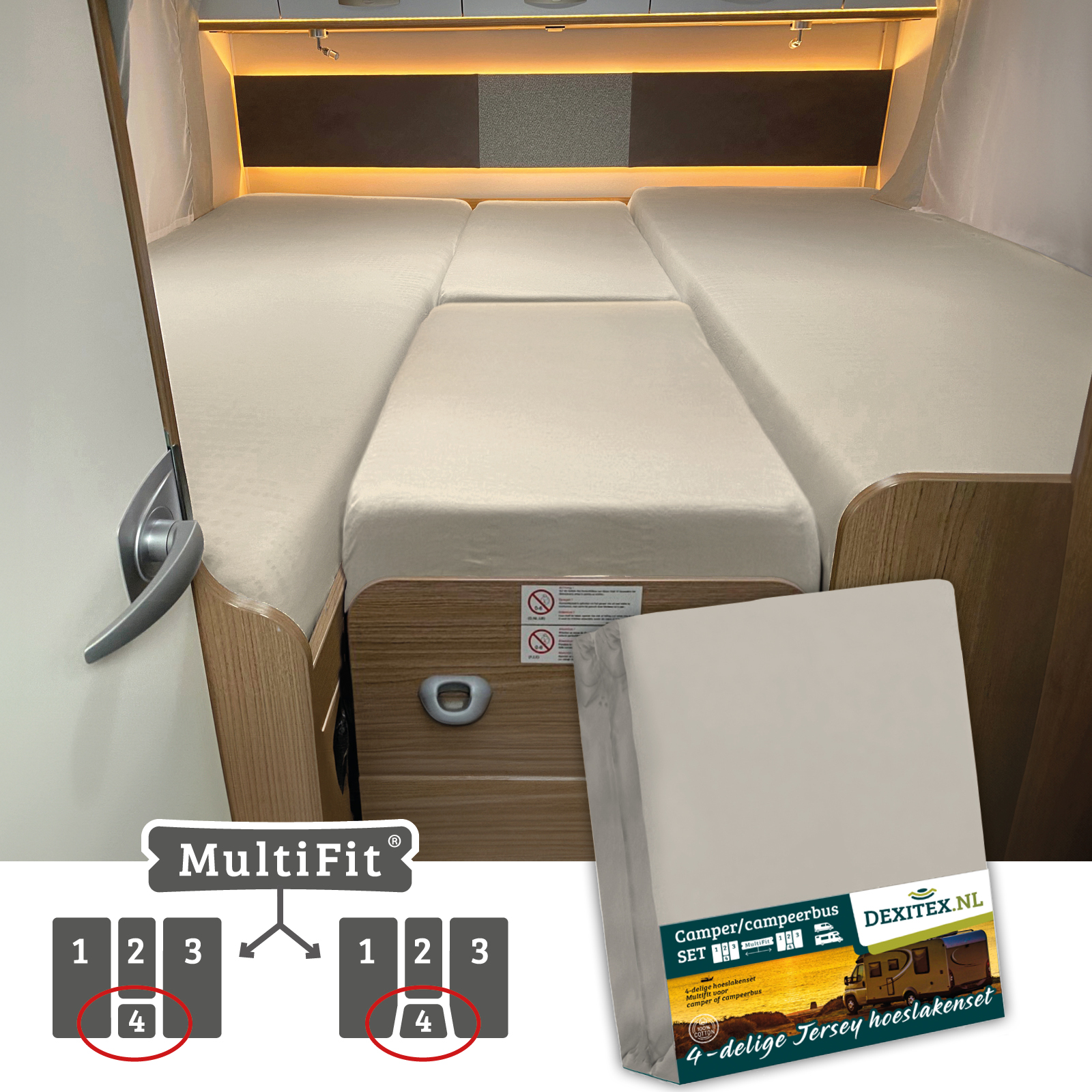 Dieses Spannbetttuch-Set ist speziell für die 4-teilige Matratzenanordnung im Wohnmobil oder Wohnwagen konzipiert. Das Set enthält 4 Jersey-Spannbettlaken. Eine für die linke Matratze, eine für die rechte Matratze und eine speziell zugeschnittene für die Mitte. So sind alle 4 Matratzen perfekt und sauber ausgelegt.